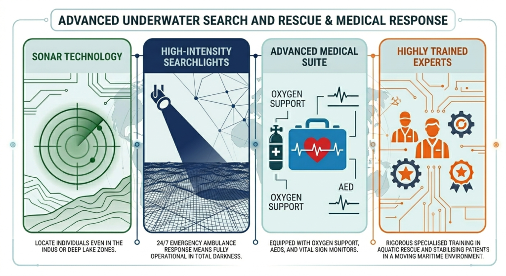 Can the boat ambulance handle night-time rescues?Absolutely. Our boats are equipped with high-intensity searchlights and navigational sonar, allowing for a full 24/7 emergency ambulance response even in poor visibility or late at night.
