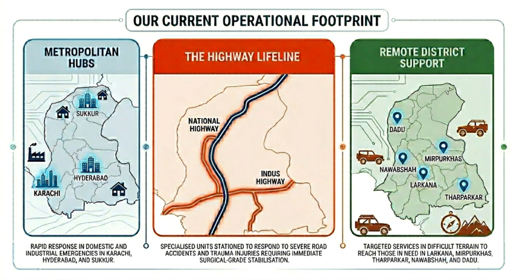 We are constantly evaluating our data to identify “black spots” where response times can be improved. This data-driven approach allows us to station our units—whether they be bikes, boats, or vans—exactly where they are needed most. From the bustling streets of Karachi to the quiet banks of the Indus in Sukkur, our presence is a promise that help is never far away.